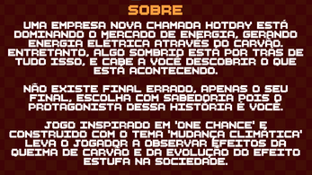 Em A Hot Day, você mergulha em uma narrativa intensa sobre ambição, culpa e sobrevivência em um mundo consumido pelo calor. A HOTDAY, uma corporação global de energia, promete “energia para todos”, mas às custas do meio ambiente e da humanidade.